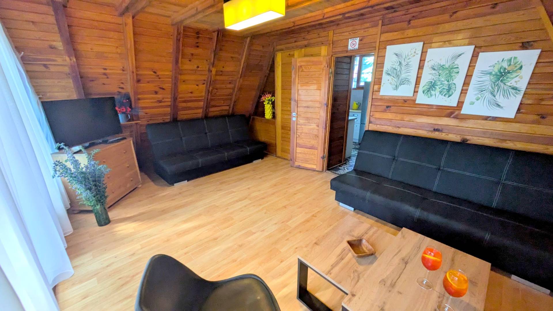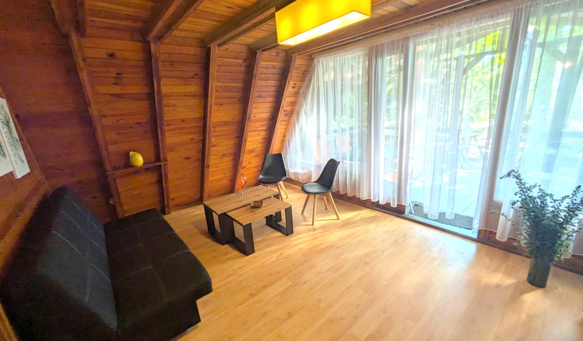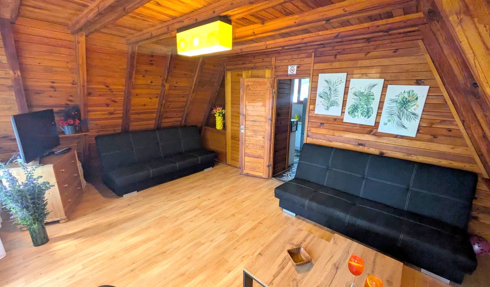Domek typu Tramp nr 1. Położony jest ok. 250m od jeziora w spokojnej części Ośrodka Skorzęcińskiego (do najbliższego sklepu ok. 80m). Domek 6-8 osobowy składa się z trzech pokoi, kuchni, łazienki, zadaszonego tarasu. Na parterze znajduje się duży pokój z dwoma dwuosobowymi kanapami, łazienka i kuchnia. Na piętrze są dwa pokoiki z dwoma łóżkami jednoosobowymi w każdym z nich. -wyposażenie łazienki to umywalka, wc-kompackt, kabina prysznicowa -wyposażenie kuchni to zlewozmywak, szafki kuchenne, kpl. garnków, sztućców, naczyń, kuchenka dwupalnikowa, lodówka, czajnik bezprzewodowy, zaparzacz do kawy -w wyposażeniu domku są także meble ogrodowe na tarasie oraz grill. Cena obejmuje pościele, wszystkie media, dwa miejsca parkingowe. Domki rokrocznie przechodzą modernizację i niezbędne remonty. W domku nie może przebywać więcej niż zadeklarowana ilość osób. W przypadku pobytu dłuższego niż trzy tygodnie lub pobytu w pierwszym lub ostatnim tygodniu wakacji istnieje możliwość negocjacji cen. Rezerwacja zostaje przyjęta i potwierdzona poprzez e-mail lub sms po otrzymaniu wpłaty w wysokości ok. 30% wartości całego pobytu. Opłaty dodatkowe: opłata klimatyczna(wysokośc ustala Gmina Witkowo),wjazd na teren ośrodka(wysokośc ustala Gmina Witkowo)