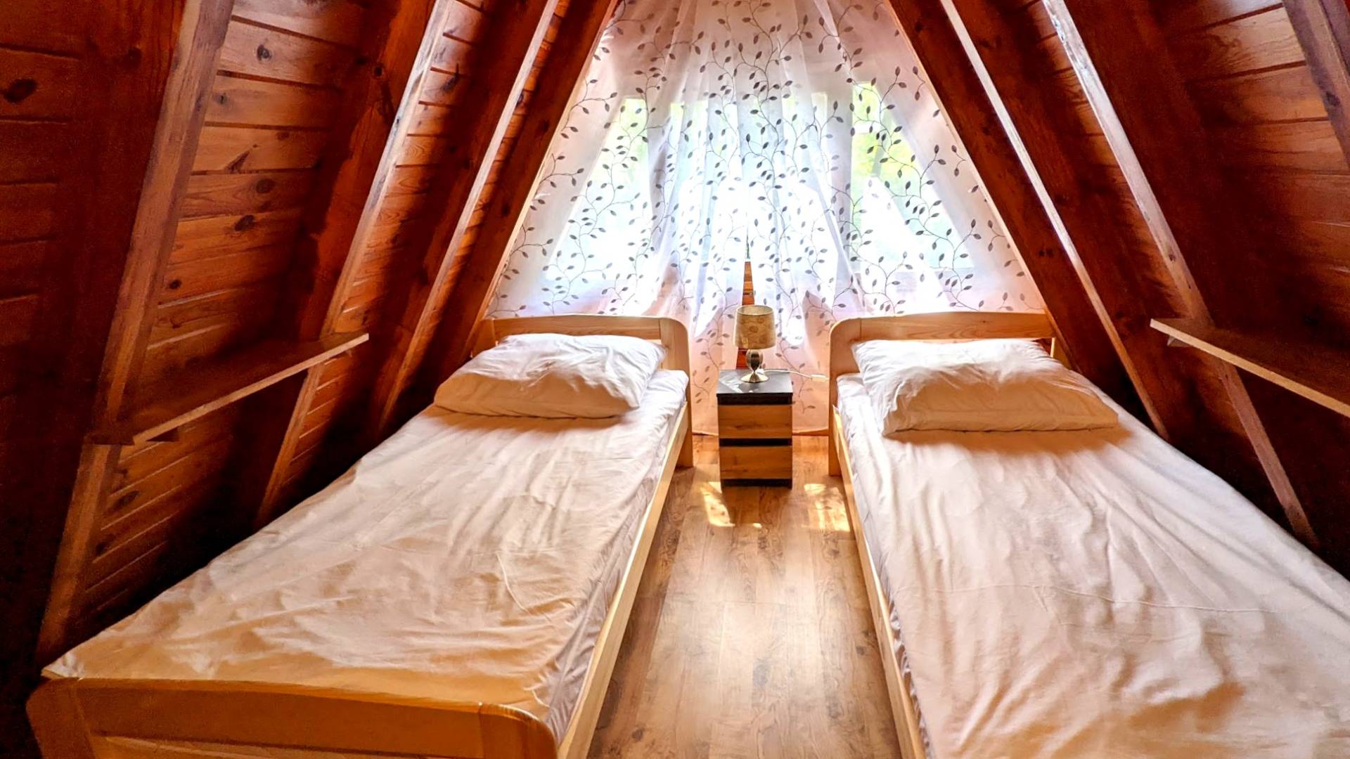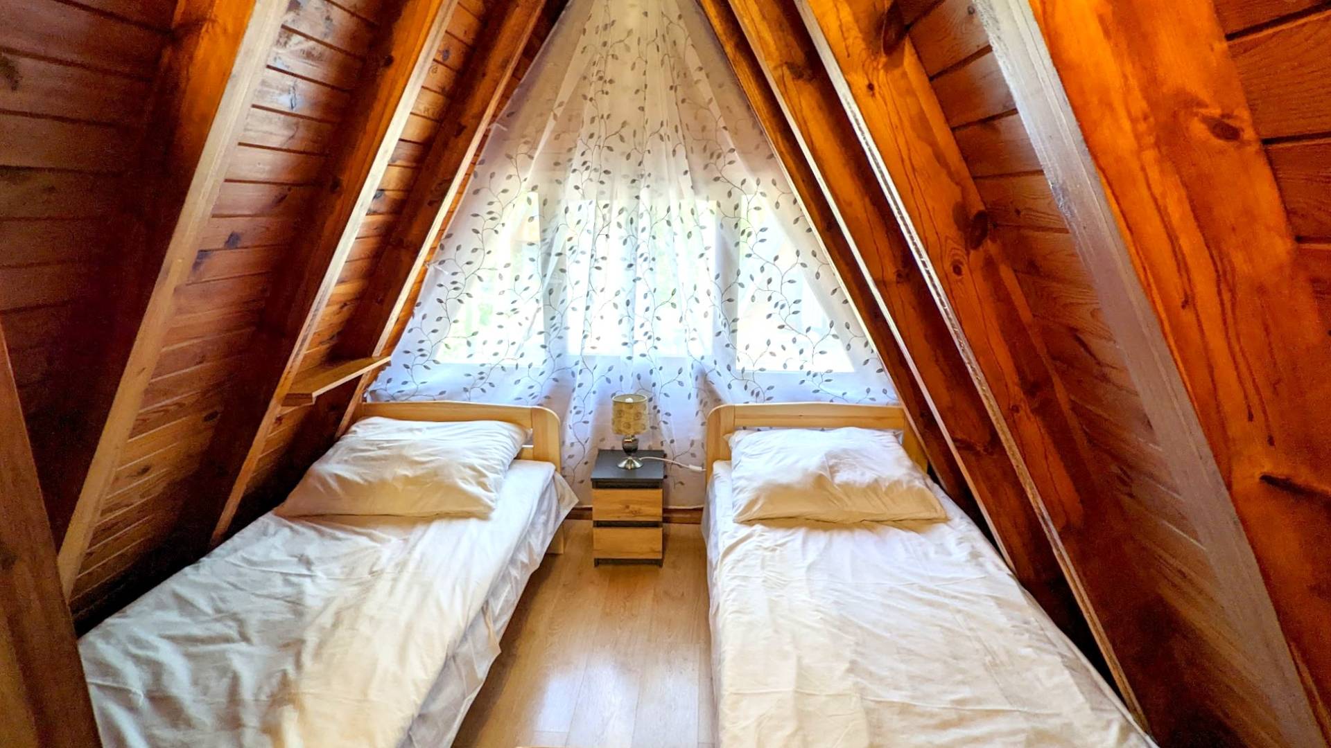 Domek 6-8 osobowy składa się z trzech pokoi, kuchni, łazienki,zadaszonego tarasu. Na parterze znajduje się duży pokój z dwoma dwuosobowymi kanapami, łazienka i kuchnia. Na piętrze są dwie sypialnie z dwoma łóżkami jednoosobowymi w każdej z nich. W łazience znajduję się wc, umywalka oraz kabina prysznicowa. W pełni wyposażona kuchnia (lodówka, czajnik, płyta ceramiczna kpl. garnków, sztućców, naczyń. Na wyposażeniu domku są także meble ogrodowe na tarasie oraz grill.