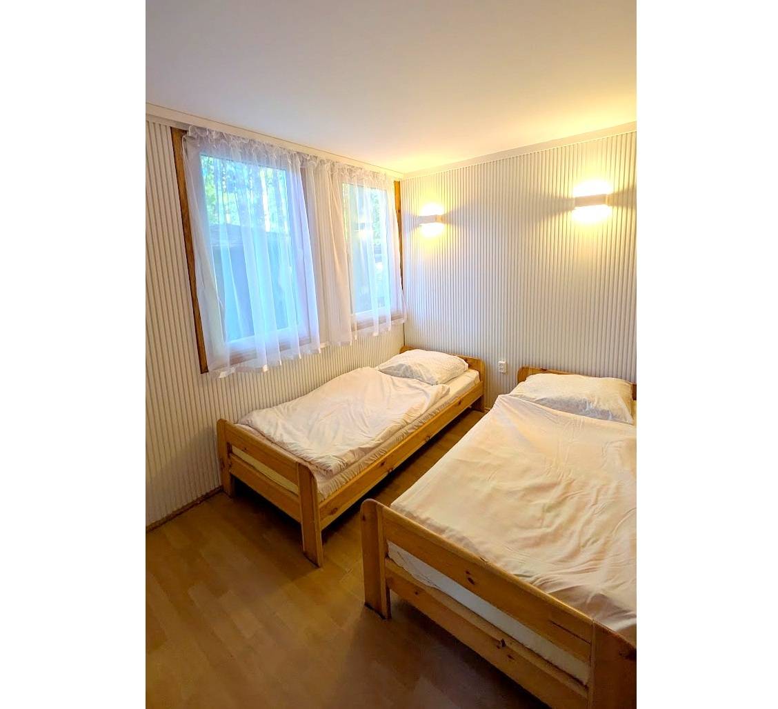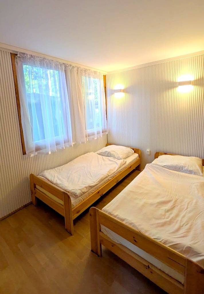 Domek czteroosobowy nr. 4 położony jest ok. 200m od plaży w spokojnej części Ośrodka Skorzęcińskiego. Do najbliższego sklepu jest ok. 150m (Okolice Orlej Góry). Domek składa się z dwóch pokoi, aneksu kuchennego, łazienki, dużego zadaszonego tarasu. -w jednym pokoju znajdują się dwa łóżka jednoosobowe, szafa, stolik -drugi pokój wyposażony jest w kanapę dwuosobową, wypoczynek (dwa fotele i ława) -wyposażenie łazienki to umywalka, wc-kompackt, kabina prysznicowa -wyposażenie kuchni to zlewozmywak, szafki kuchenne, kpl. garnków, sztućców, naczyń, kuchenka dwupalnikowa, lodówka, czajnik bezprzewodowy, zaparzacz do kawy -w wyposażeniu domku są także meble ogrodowe na tarasie oraz gril. Cena obejmuje pościele, wszystkie media, miejsce parkingowe. Domki rokrocznie przechodzą modernizację i niezbędne remonty. W domku nie może przebywać więcej niż zadeklarowana ilość osób. W przypadku pobytu dłuższego niż trzy tygodnie lub pobytu w pierwszym lub ostatnim tygodniu wakacji istnieje możliwość negocjacji cen. Rezerwacja zostaje przyjęta i potwierdzona poprzez e-mail lub sms po otrzymaniu wpłaty w wysokości ok.30% wartości całego pobytu.Opłaty dodatkowe: opłata klimatyczna(wysokośc ustala Gmina Witkowo),wjazd na teren ośrodka(wysokośc ustala Gmina Witkowo)